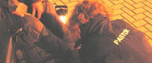 A Street Minister on the street: A photo of an original member of the Agape Street Pastors (now called STREET MINISTERS) visiting the Homeless. An existing founder member is seen here in Oct 2007 first 'washing' feet and then applying simple 'first aid' - helping, with emergency treatment for a man who was a rough sleeper!