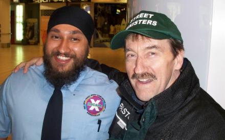 George is the Founder of the STREET MINISTERS Project and his aim is to work closely together with the executive managementand the security managers of the City Centre, to find out how we can all work together on the homeless issues, as they develop around this new City, within the shopping centre and theatre district and beyond into the many estates, seen here with a local friendly Security man, who was also a next door neighbour to George.